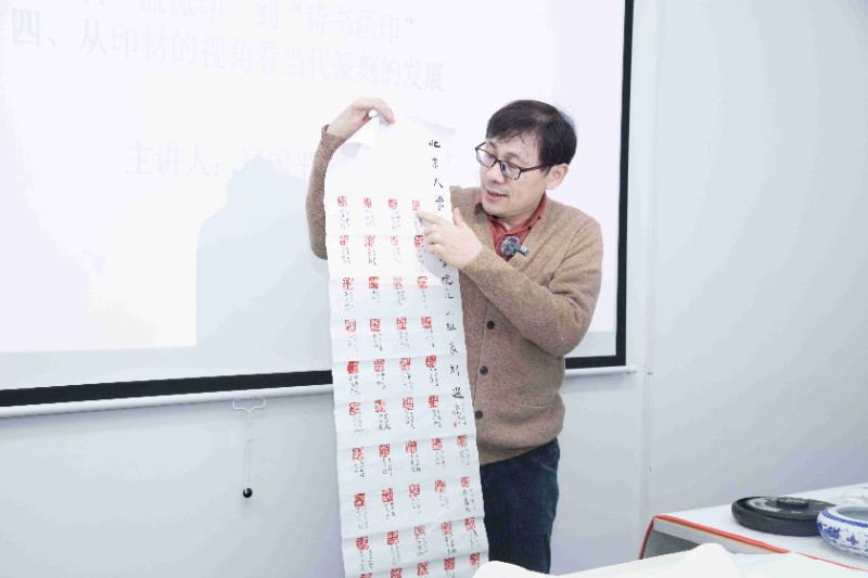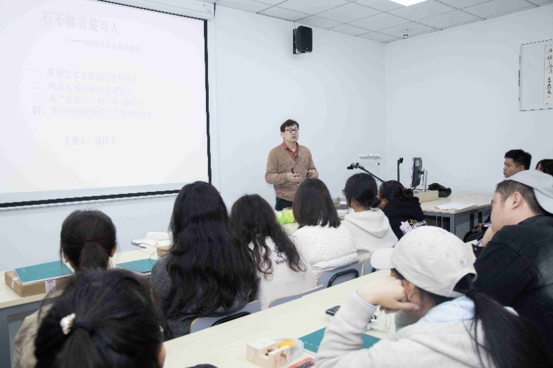 时间:2024-10-28 分享:书法名师逯国平老师带来的篆刻艺术课程“石不能言最可人…明清以来流派印漫谈”圆满落下帷幕,吸引了众多艺术爱好者前来聆听。课堂上掌声不断。“操刀如笔石为纸,方寸之间天地宽。”篆刻艺术,实乃博大精深,于小小印章之上尽显无尽韵味与巧思。诚如法国雕塑家罗丹所言:“生活中不是缺少美,而是缺少发现美的眼睛。”篆刻艺术便是那等待着我们去用心发现的美之瑰宝。 在此次课程中,逯国平老师先是详尽地讲解了篆刻艺术发展的历史与所涉及的材质,尤其着重阐述了明清时期石质印材的普遍使用,及其对篆刻艺术发展起到的有力推动作用。逯老师深入解读了从流派印到“诗书画印”的演变历程,生动展现了不同艺术形式相互融合所碰撞出的奇妙火花。逯老师从印材的视角探讨了当代篆刻艺术的发展态势,为学员们开启了展望未来的新思路。逯老师讲解精彩生动、深入浅出,此次课程无疑为广大篆刻艺术爱好者搭建了一个优质的学习与交流平台。希望在今后的日子里,大家能怀揣着对篆刻艺术的这份热爱,如同追逐璀璨星辰般,继续深入探索这片艺术的浩瀚星空,不断前来汲取知识的养分,让篆刻艺术在我们的生活中绽放出更加绚烂的光彩,让那方寸之间的美妙世界永远散发着迷人的魅力!