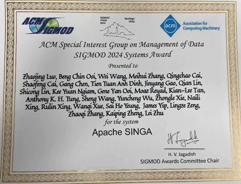 6月9日到6月15日于智利圣地亚哥召开的ACM SIGMOD 2024会议上,国际计算机学会(ACM)宣布将2024年ACM SIGMOD Systems Award授予Apache SINGA项目研发团队,以表彰其在研发分布式、高效、可扩展且易于使用的深度学习平台以用于大规模数据分析方面的贡献。主要获奖人员包括我校伟德国际1949官网教授张美慧、罗兆经。