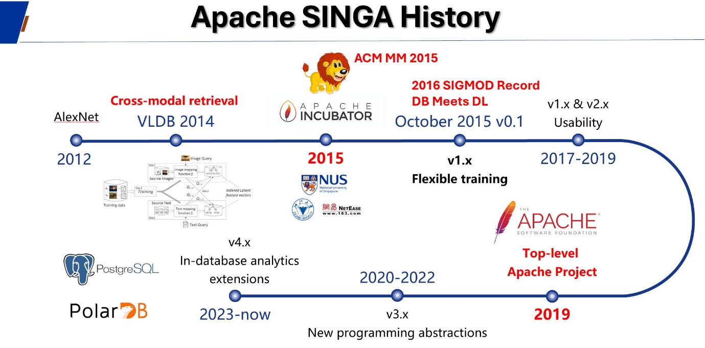 本次获奖的Apache SINGA是第一个专注于分布式深度学习的Apache项目,并凭借其卓越的性能与Tensorflow、Pytorch等平台一同并评为全球十大机器学习框架。在过去十年间,Apache SINGA共发布14个版本,项目研发重心历经灵活的训练框架、系统可用性、改进的编程框架、数据库内分析等不同阶段。Apache SINGA 应用于阿里巴巴、字节跳动、网易、新加坡国立大学医院、新加坡中央医院、花旗集团、西门子等全球知名组织与公司,跨越银行、教育、金融、医疗保健、房地产、网络安全和软件开发等多个应用领域。